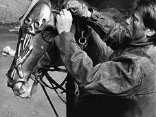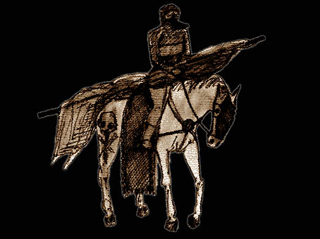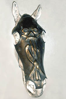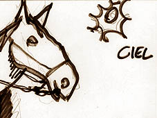Les chevaux… De couleur alezan, habillés d’une cuirasse de tête noire, d’une boucle de poitrail à sangles de cuir, d’une longue couverture de laine noire. Ils ont un grand tag blanc sur chaque croupe. |