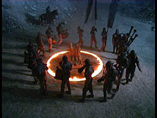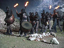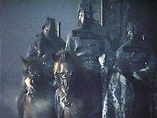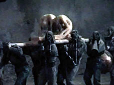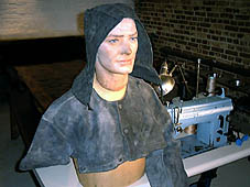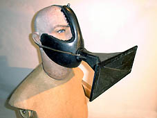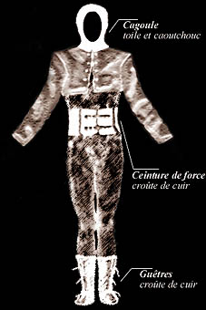 Habillés d’un boléro de cuir couvrant épaules et bras, d’une cagoule de toile rigide, de guêtres de cuir, d’une combinaison de toile grise. Ils portent des drapeaux repliés et chantent dans des porte-voix fixés sur leur tête. |