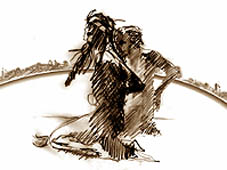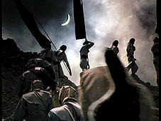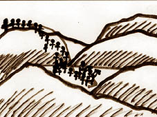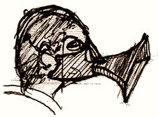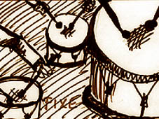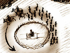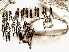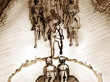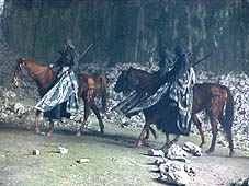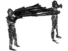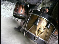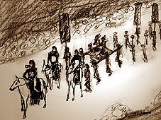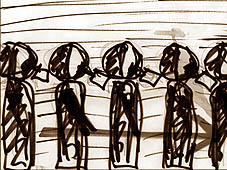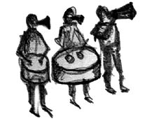 Les dix-huit marcheurs Ils composent l’essentiel de la troupe et ont chacun un instrument différent. Des chanteurs avec des porte-voix, des joueurs de tambours, des grosses-caisses, des souffleurs de bombardes et de cornemuses, un jeu d’orgue… Trois d’entre eux portent de grands drapeaux verticaux, leur visages et leurs mains sont noircis par les poussières du voyage. |